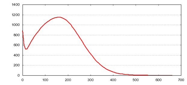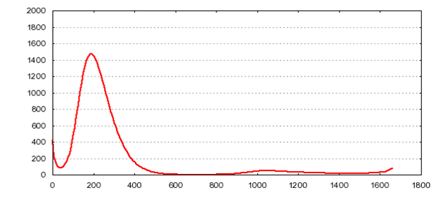 This graph shows the average input speed of users. As explained earlier, this is the average derived from complex calculations after removing noise. The horizontal axis represents speed in milliseconds, and the vertical axis represents the number of users in that range. Beautifully, it shows a normal distribution around 200ms. According to our internal tests, an average person's thoughtless double-click comes out to about 100-200ms. We started inferring that users below 100ms in this data range might be using rapid clicking.