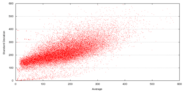 This is the correlation between the two data sets. The horizontal axis is the average, and the vertical axis is the standard deviation. It looks somewhat like an asteroid field. We are focusing on the dust particles from this asteroid that have low values on both the y-axis and x-axis. Setting the average at 50ms and standard deviation at 50ms resulted in about 1% of all users. More surprisingly, those users included in the data were already known to have a high macro detection rate. By this point, you might have caught on.